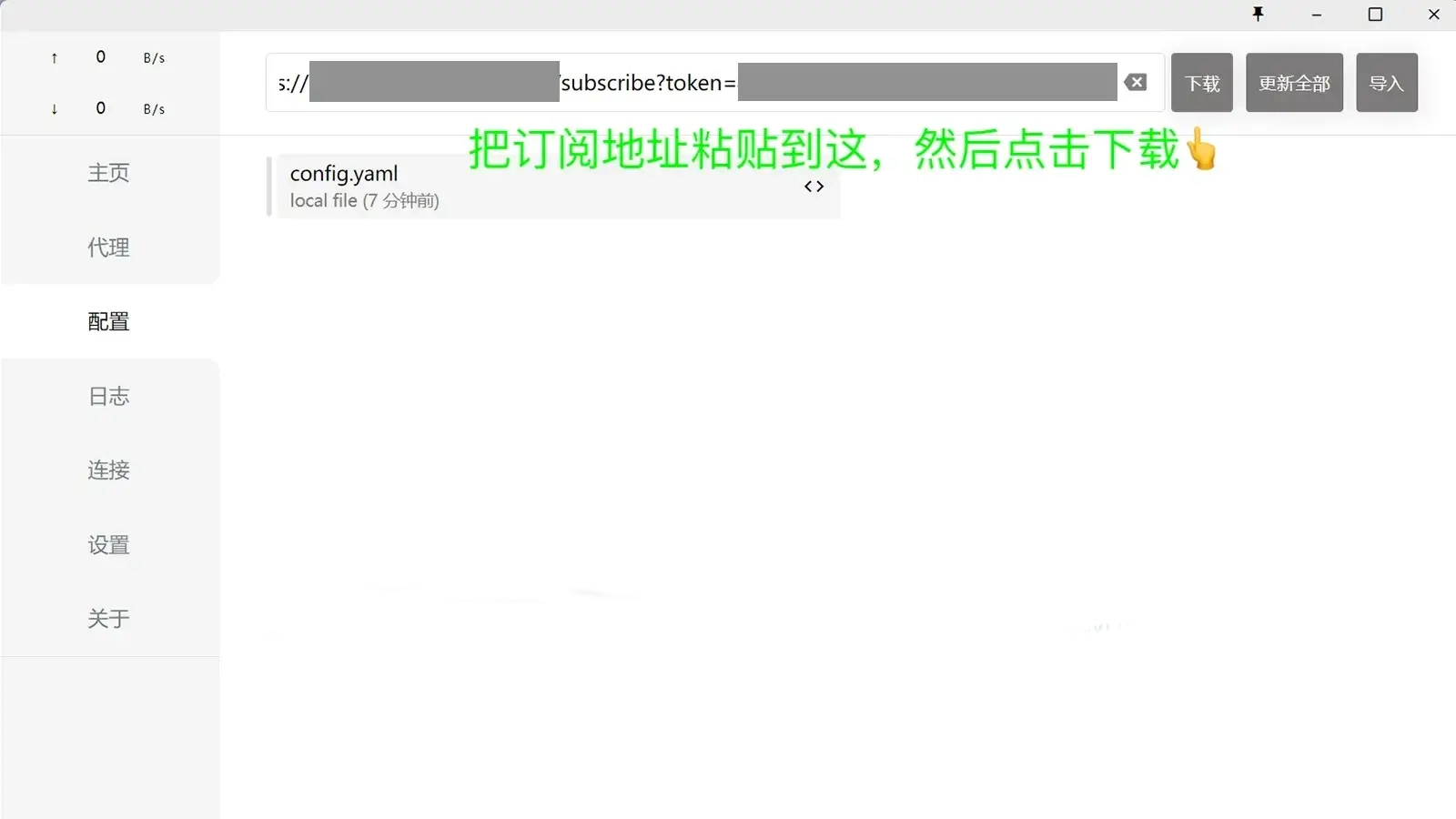 遇到自动导入下载配置失败或无响应,您可先点击首页的导入订阅,再点击复制订阅地址,然后如下图所示:粘贴到订阅地址的输入栏,再点击下载按钮。