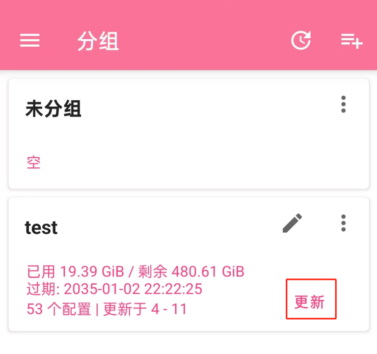 保存后在分组页面可以看到刚才添加的订阅分组,点击【更新】后即可更新节点订阅链接,如下图所示: