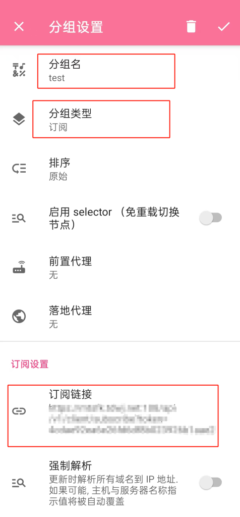 在分组界面,点击右上角的 ➕ 号按钮即可出现【分组设置】界面,在【分组名】输入自己能区分这个分组的内容,分组类型选择订阅,然后在订阅设置的【订阅链接】输入机场节点订阅地址,点击右上角的 ✔ 按钮保存即可,如下图所示: