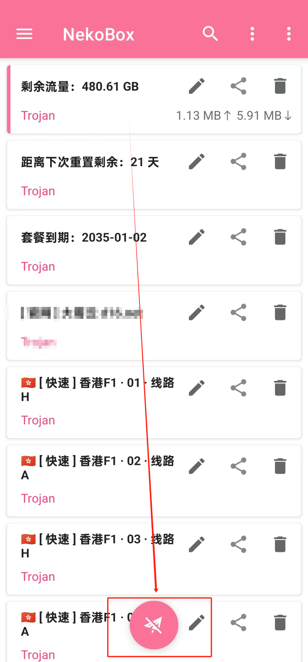 随后回到软件的主界面,可以看到刚刚新增的节点订阅地址,选择任意一个节点,点击软件主界面最底部的按钮进行服务器连接,在弹出的对话框【允许”NekoBox”创建 VPN 连接吗?】点击允许即可,如下图所示: